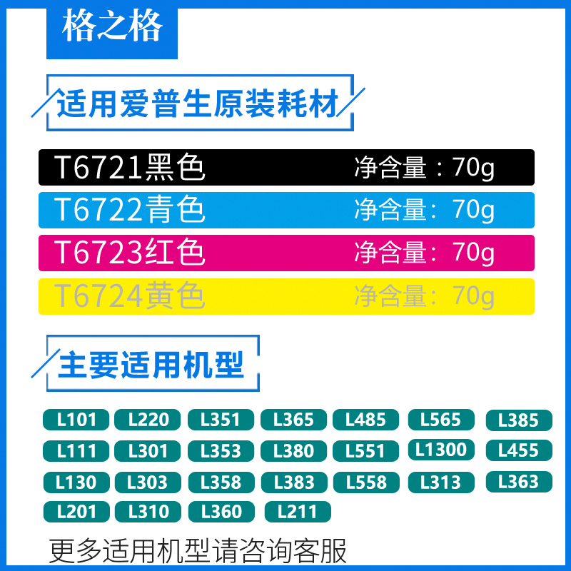 T6723 Red (about 6500 pages can be mixed with the original) T6722 cyan (about 6500 pages can be mixed with the original) (red cyan yellow black bottle each) A set of T6724 yellow (about 6500 pages can be mixed with the original) T6721 black (about 4000 pages can be mixed with the original)