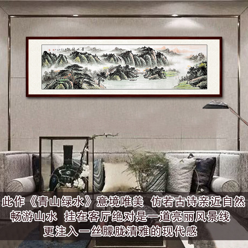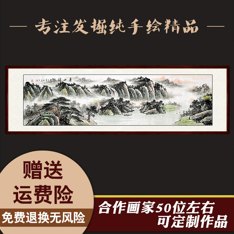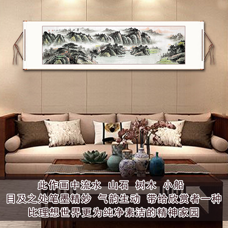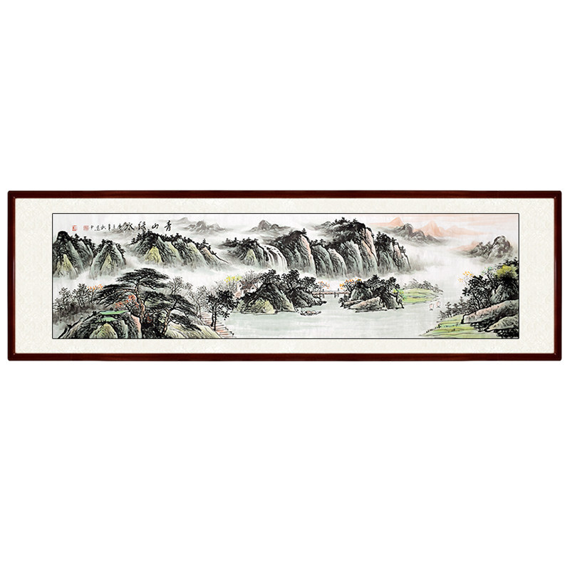 Pure hand-painted green mountains and green water landscape painting Chinese painting Ink painting Living room office horizontal version hanging painting core scroll can be framed