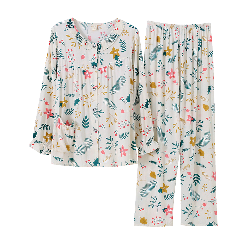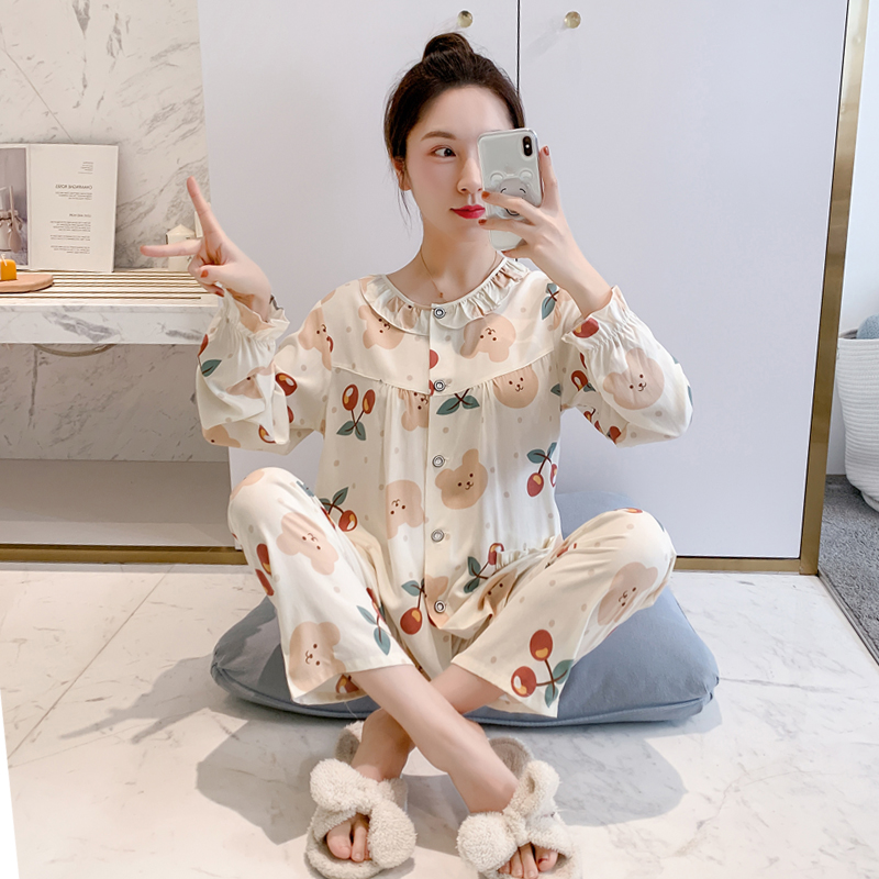 Light and breathable spring and autumn summer cotton silk long sleeve pajamas women's thin cotton cardigan large size summer air-conditioned clothing