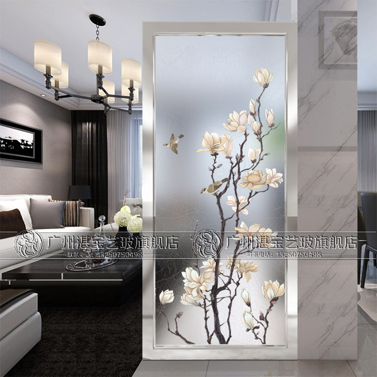 Art glass Chinese porch background dining room aisle partition screen cabinet sliding door suspended ceiling simple magnolia butterfly