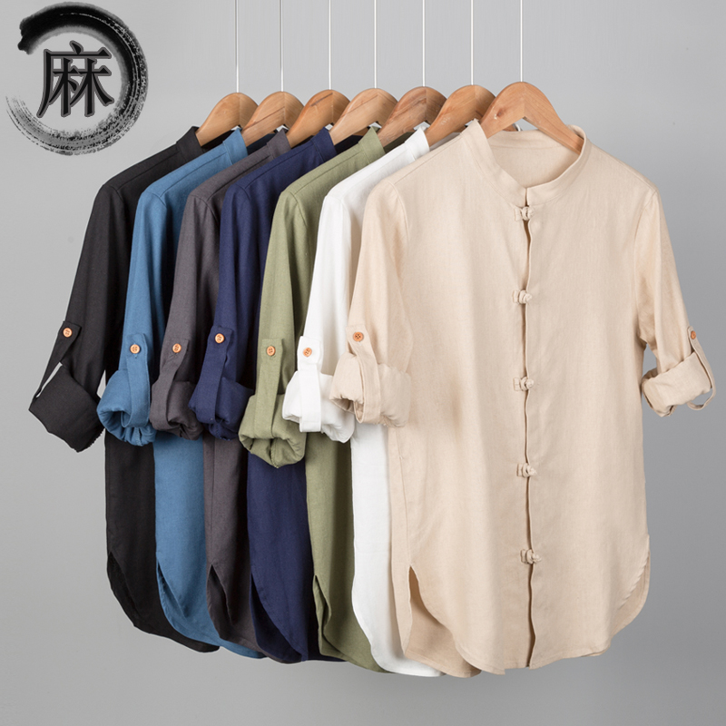 Chinese style men's stand-up collar button linen large size long-sleeved shirt ethnic literary cotton and linen loose shirt men's