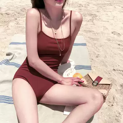 ins wind retro burgundy sexy one-piece bikini with small breasts gathered to cover the belly, thin and conservative hot spring swimsuit women
