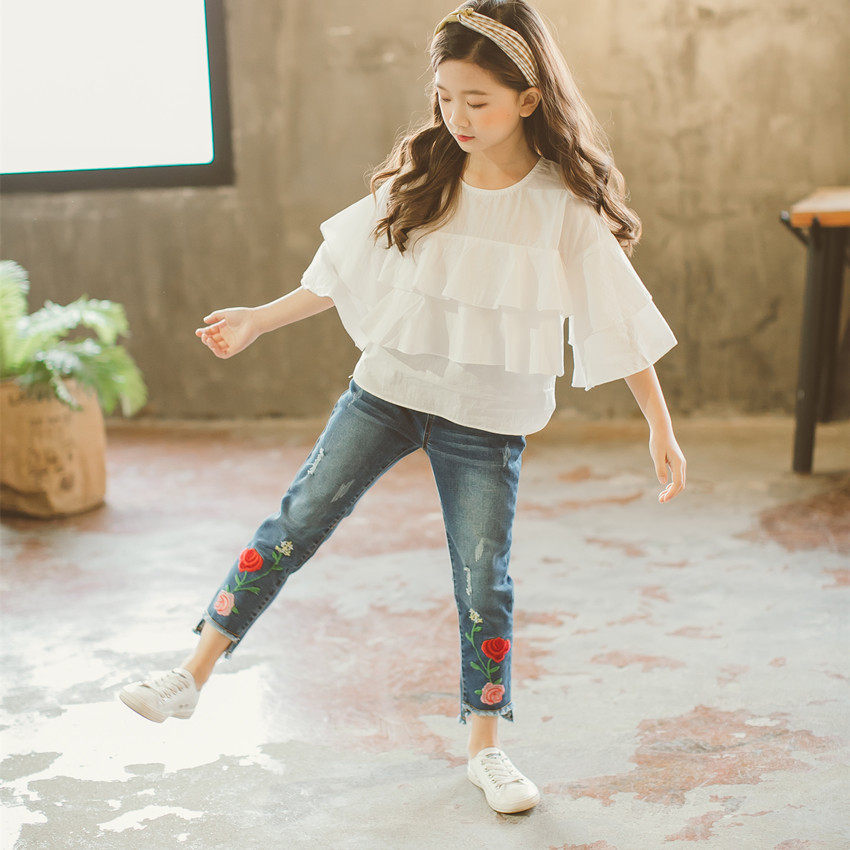 Girls suit 2020 Korean board spring new two-piece embroidered jeans white flared sleeve top