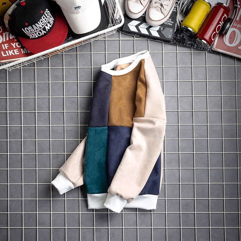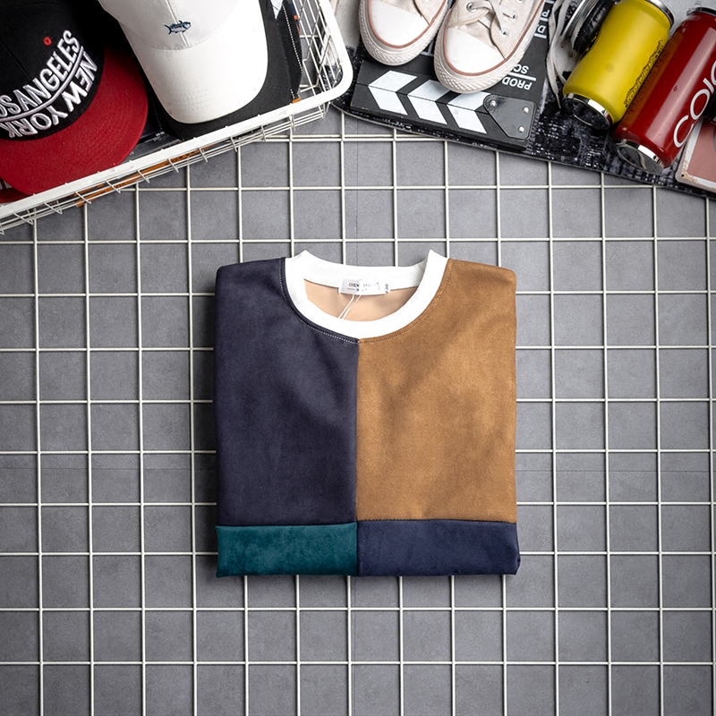 Spring Autumn 2021 Little Fresh Plaid Splicing Color Long Sleeve T-shirt Male Deer Leather Suede Korean Version Casual Thin Coat Sweater