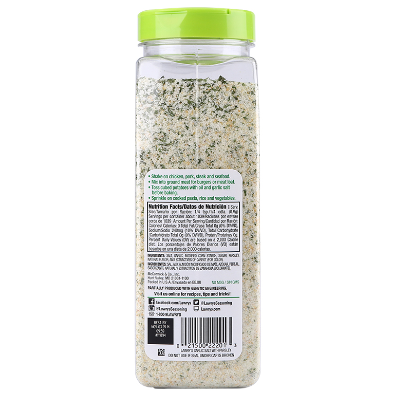 Salt garlic modified corn starch white granulated sugar parsley edible spices and carrapin extract (for color)