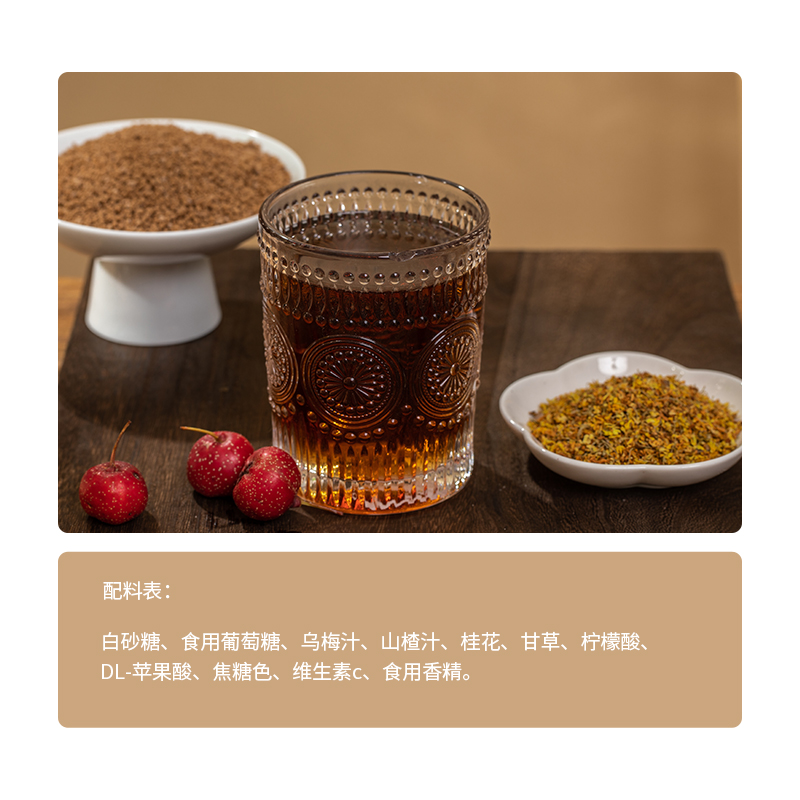 White granulated sugar edible glucose Umey juice hawthorn juice osmanthus liquorice citric acid DL-malic acid caramel colour Vitamin C edible essence