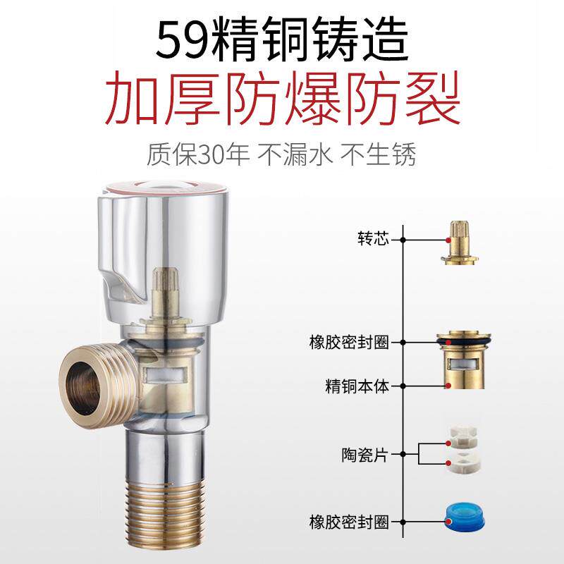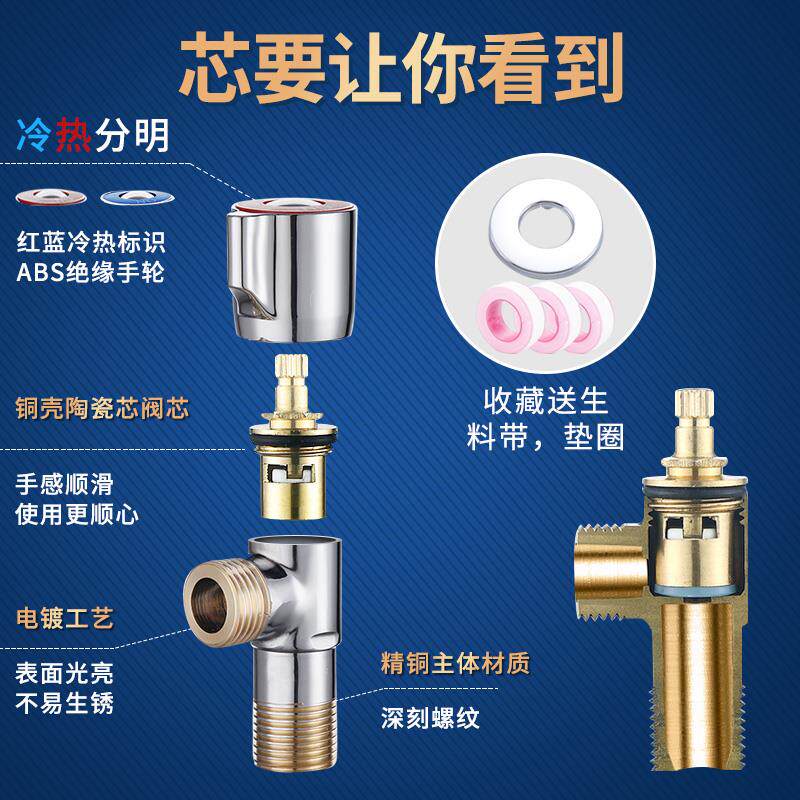 Overall all-copper thickened section (cold water) integral full copper thickened section (hot water) thickened 304 stainless steel (hot and cold universal) 304 stainless steel angle valve lined with round (cold water) 304 stainless steel angle valve one