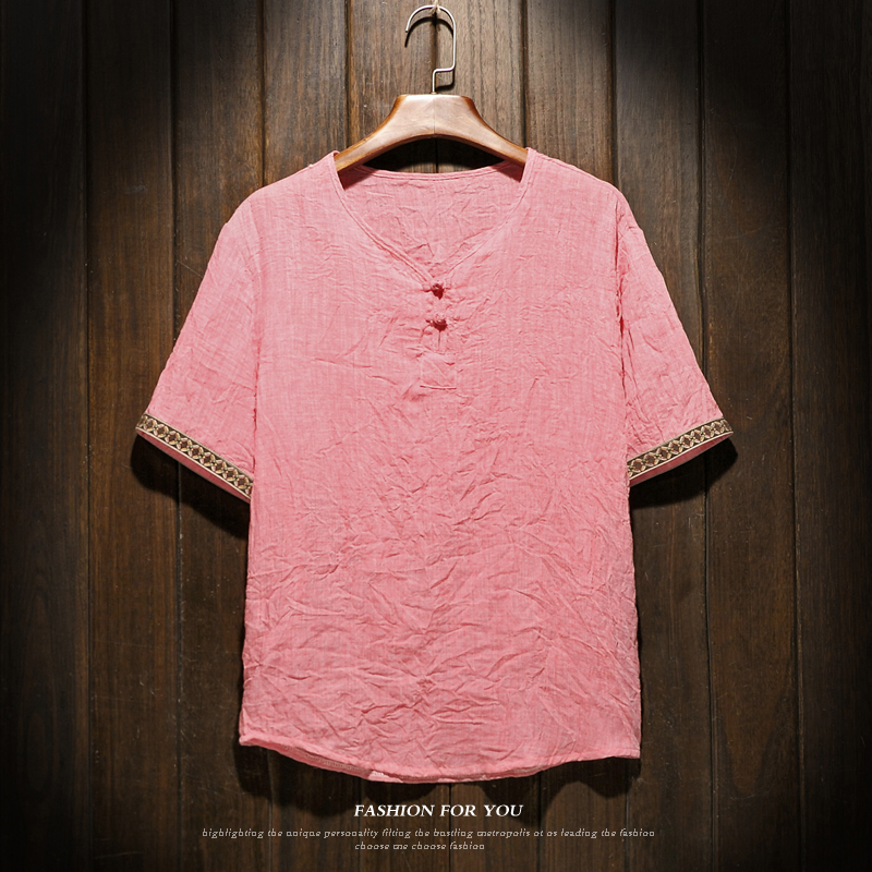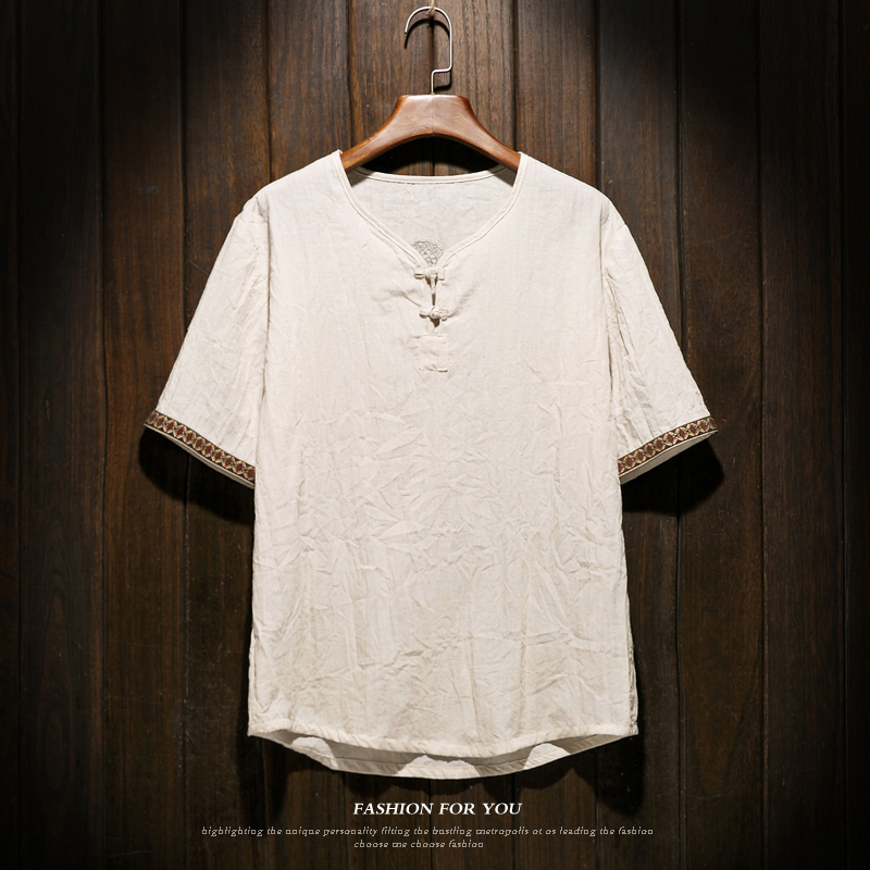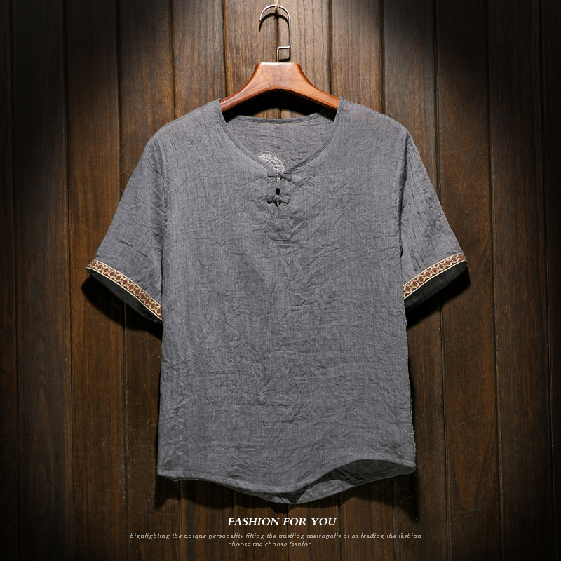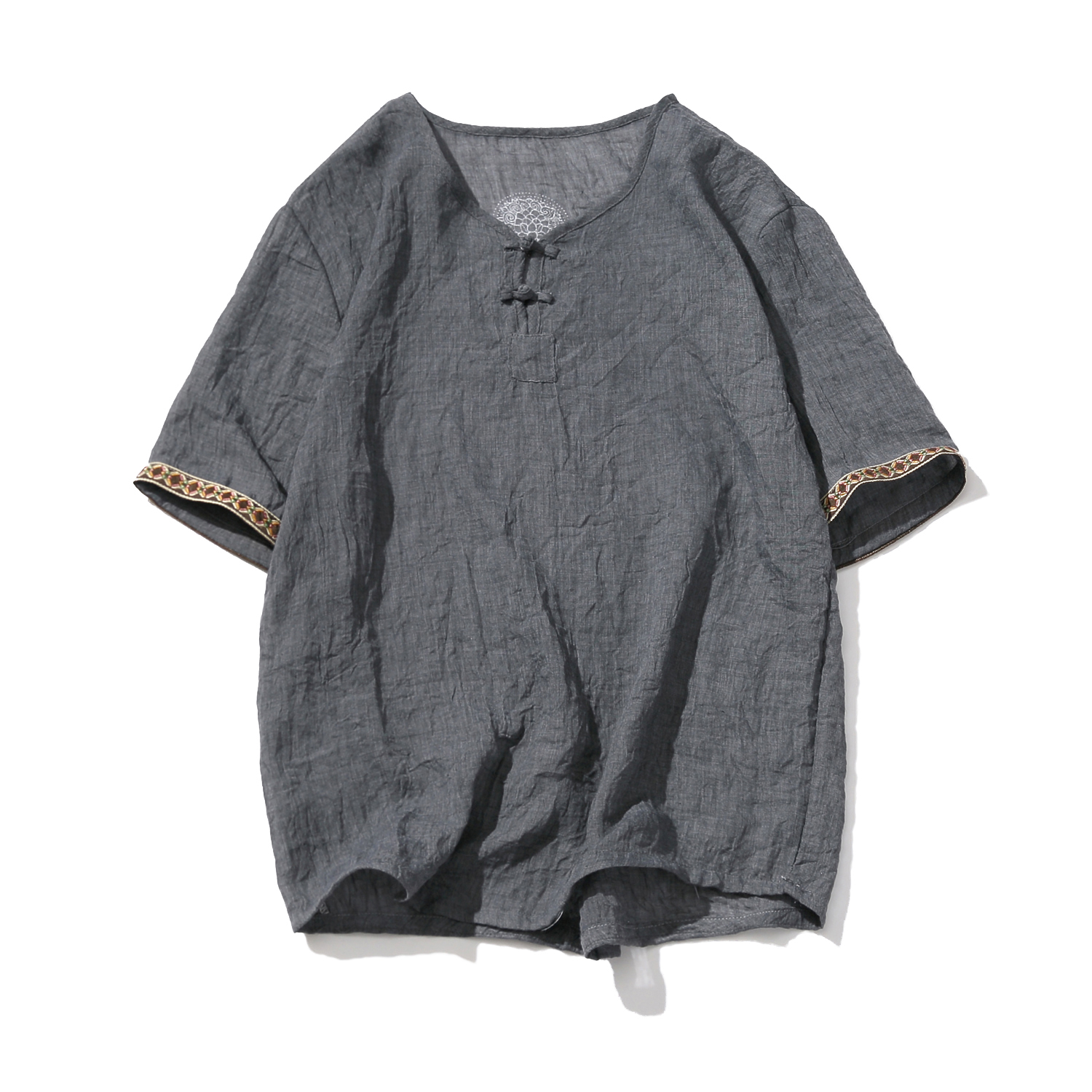Chinese style men's linen T-shirt men's short-sleeved loose large size cotton linen clothes Chinese-style linen button clothes