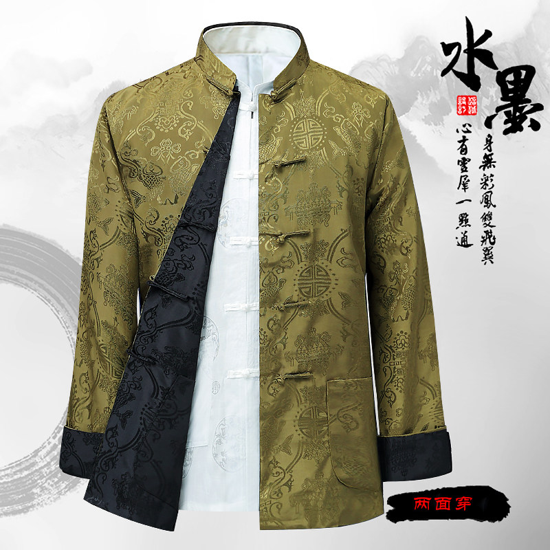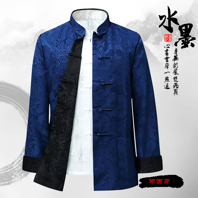 2022 Dang costume men's middle-aged and elderly thin double face wearing long sleeves jacket Spring and autumn season Chinese Wind Grandpa Costume Retro