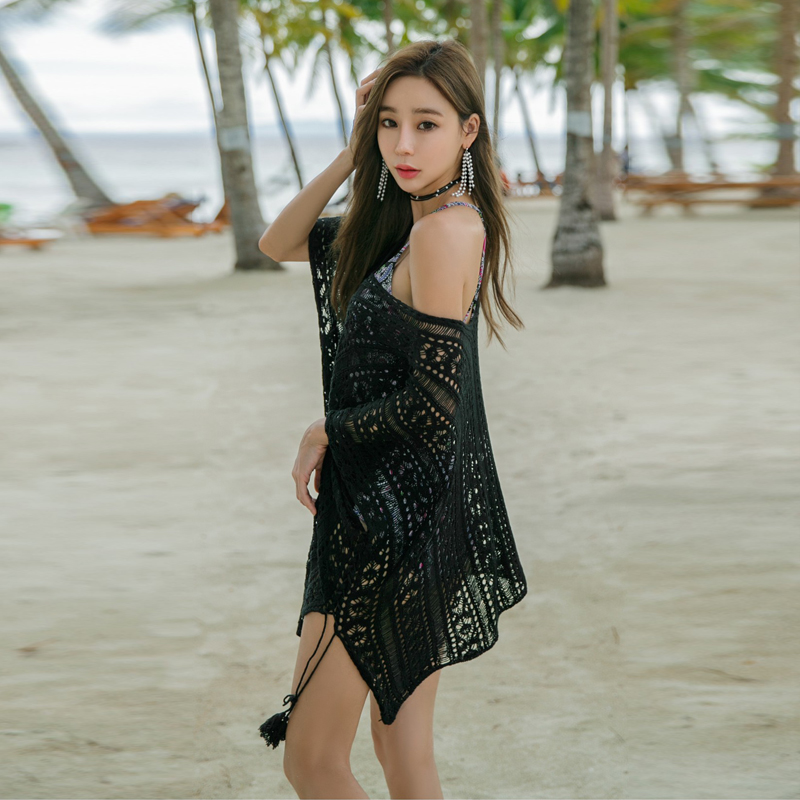 Summer Korean bikini blouse long version hollow out seaside holiday knitted sexy beach sunscreen blouse women
