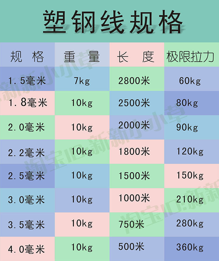 Black belt shaft 1.8 mm 2400 m 10kg black belt shaft 2.0 mm 2000 m 10kg black belt shaft 2.2 mm 1800 m 10kg black belt shaft 2.5 mm 1500 m 10kg black belt shaft 3.0 mm 1000 m 10kg black belt shaft 3.5 mm 750 m 10kg black belt shaft 4.0 mm 500 m 10kg black belt shaft 1.5 mm 2800 m 7kg white transparent 2.2 mm 1800 m 10kg white transparent 2.5 mm 1500m 10kg white transparent 3.0 mm 1000m 10kg white transparent 3 .5 mm 750 m 10kg white transparent 4.0 mm 500m 10kg white transparent 2.0mm 2000m 10kg