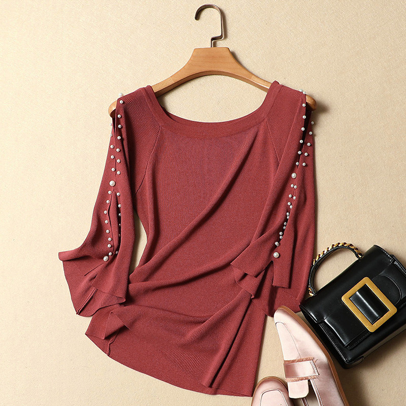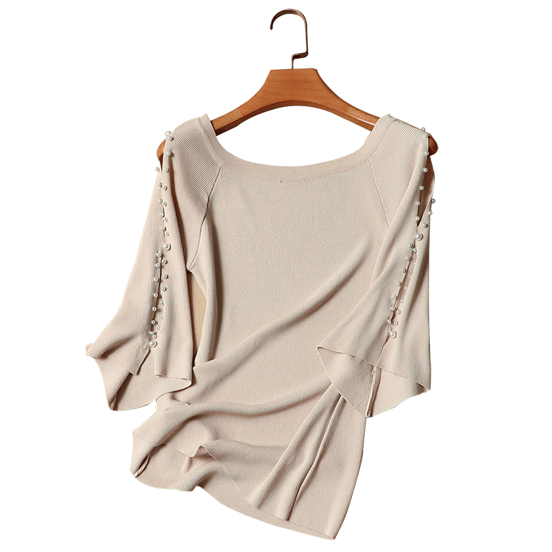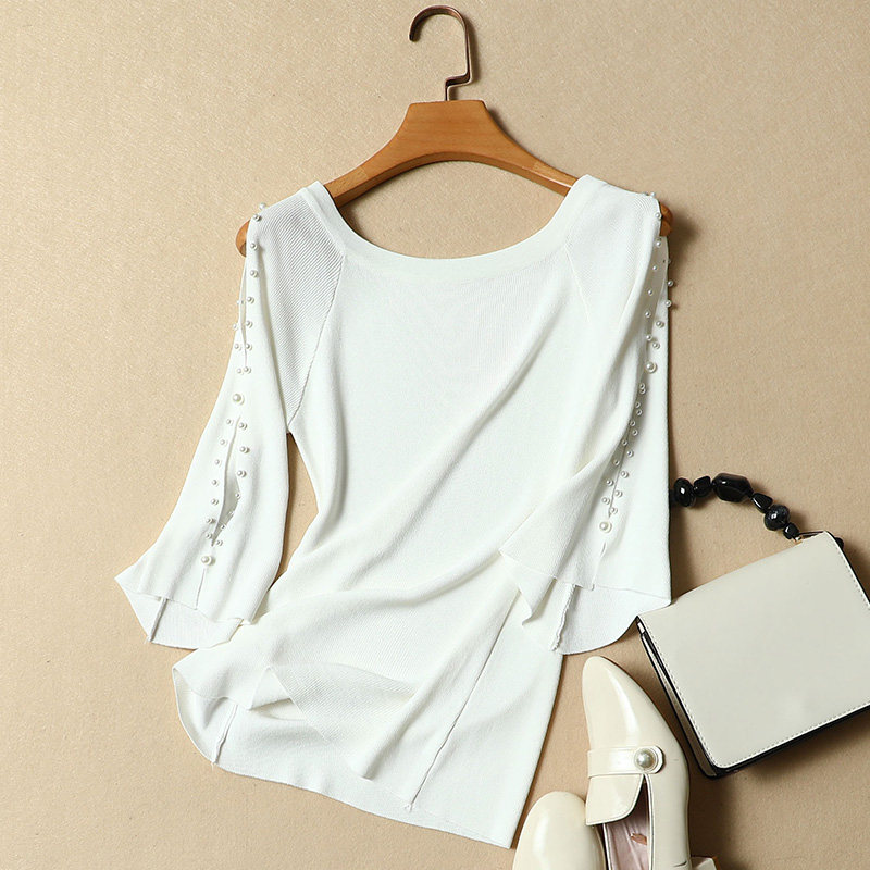 Short-sleeved t-shirt women's summer dress 2022 new women's ice silk knitted sweater slim short pullover beaded top women's tide