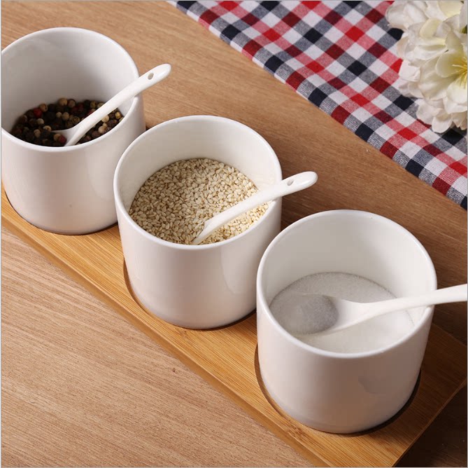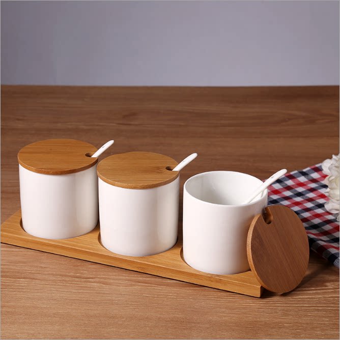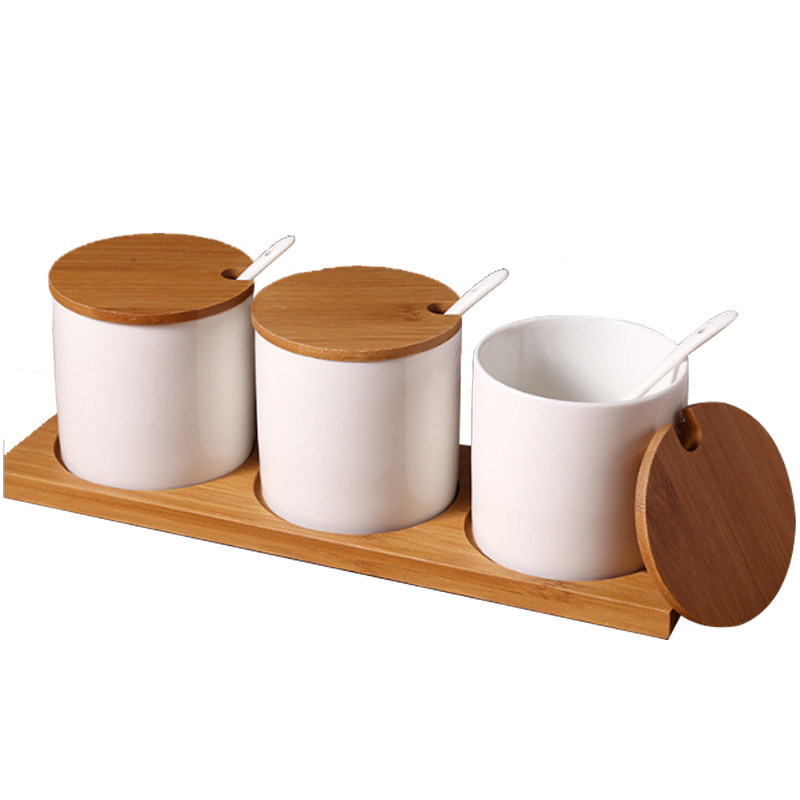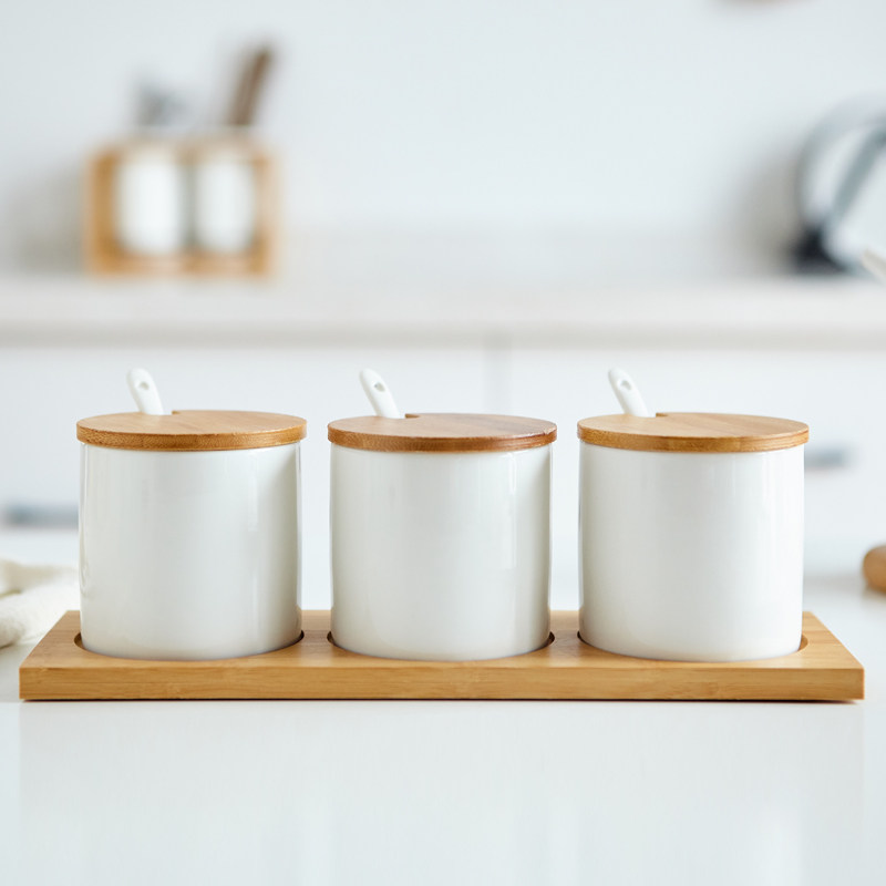 Ceramic Seasoning Jar Three-piece Solid Wood Base Solid Wood Lid Covered Hole Kitchen ceramic Seasoning Jar