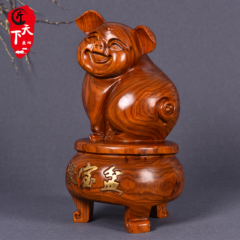 Wood carving wealth pig Zhaocai 12 zodiac pig feng shui ornaments pear solid wood carving home mahogany crafts