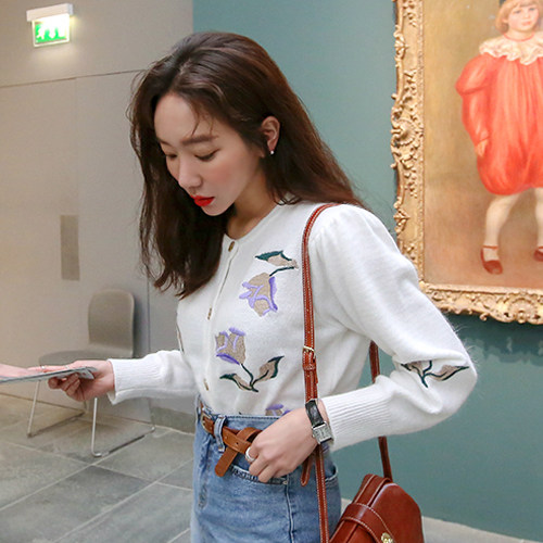 Day hair South Korean women's dress beautifully embroidered flowers single-row buttoned-knitted sweatshirt CM196