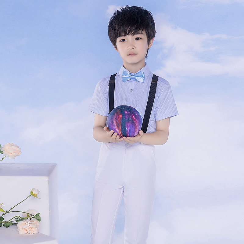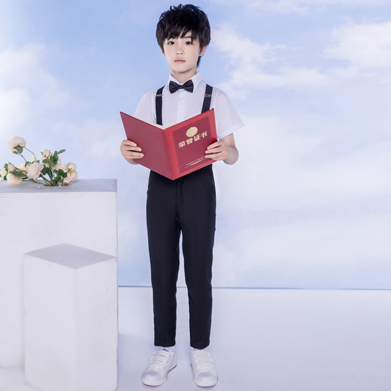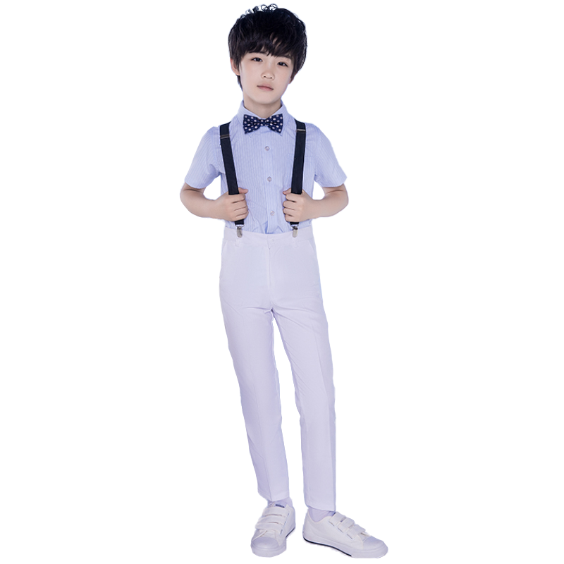 White short-sleeved shirt, black trousers with black bow tie, 4 pink striped blouse, white trousers, white suspenders, pink bow tie, 4 pink striped short shirt, white trousers, white suspenders, floral bow tie, 4 sky blue striped shirt, white trousers, black suspenders, sky blue bow tie, 4 days