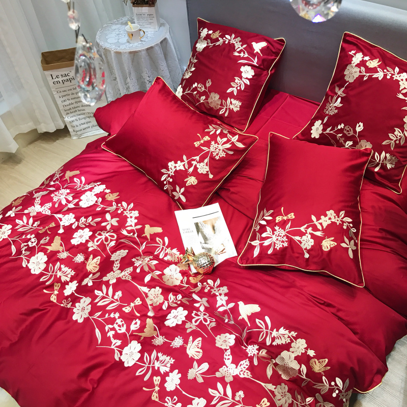 Wedding celebration European-style bed linen pure cotton bed with four pieces of full cotton 60 gung satin long suede cotton embroidered wedding bed