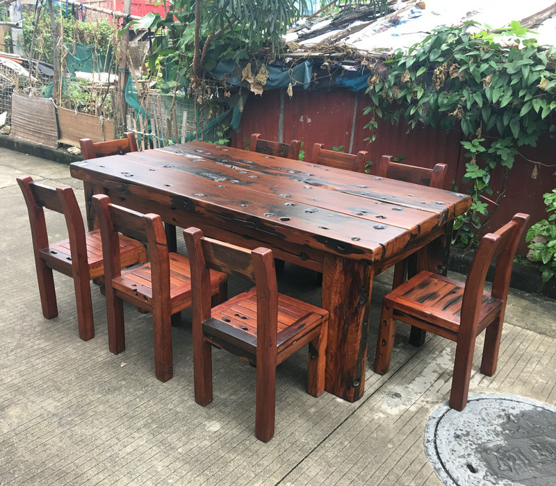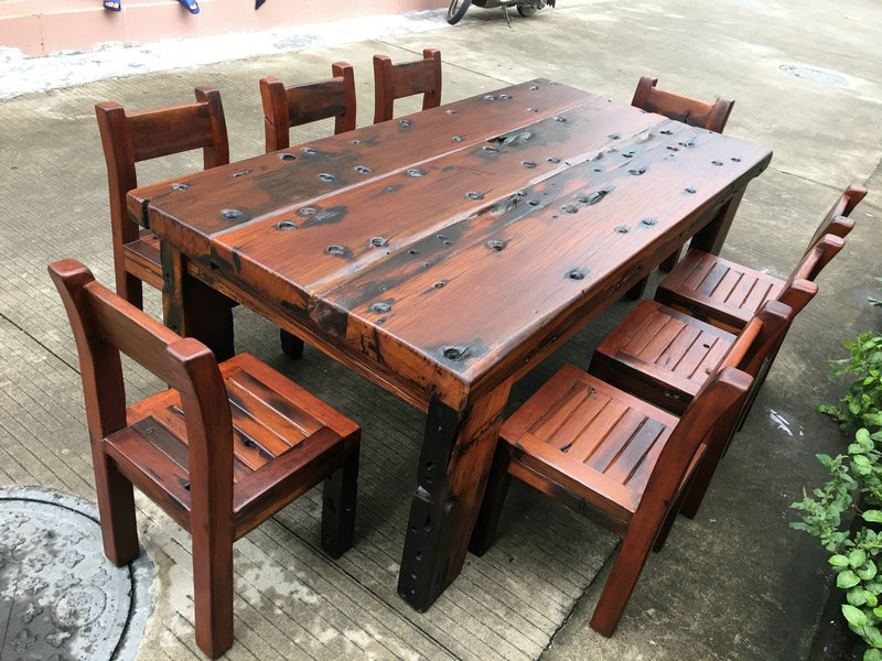 Old boat wood rectangular dining table and chairs combined solid wood Chinese style retro furniture dining room tea table table 4 6 8 10 people