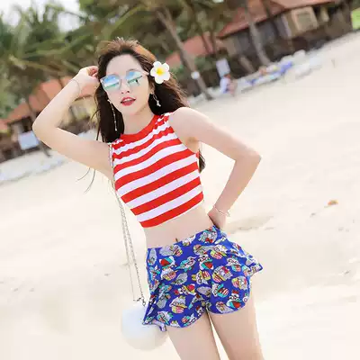 Hot spring stripe two-piece swimsuit student girl swimsuit slim two-piece skirt female flat corner small chest gathering swimsuit