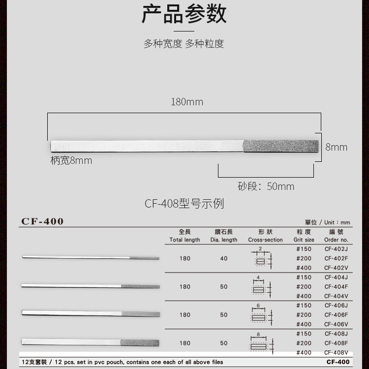 CF-400 Integrated Set CF-402 2.5mm #150 12PCSCF-402 2.5mm #200 12PCSCF-402 2.5mm #400 12PCSF-402 2.5mm #600 12PCSF-404 4mm #120 12 CF-404 4mm #150 12 CF-404 4mm #200 12 CF-404 4mm #400 12 CF-404 4mm #600 12pcs CF-406 6mm #120 12 cf-406 6mm #150 12 cf-406 6mm #200 12 cf-406 6mm #400 12 cf-406 6mm #600 12 cf-408 8mm #120 12 cf-408 8mm #150 12 cf-408 8mm #150 12 cf-408 8mm #200 12 cf-408 8mm #600 12 CF-408 8mm #400 12pcs CF-400 Red-Black Set CF-400 Sandless File CF-400 Mixed Pack (Labeled Version)