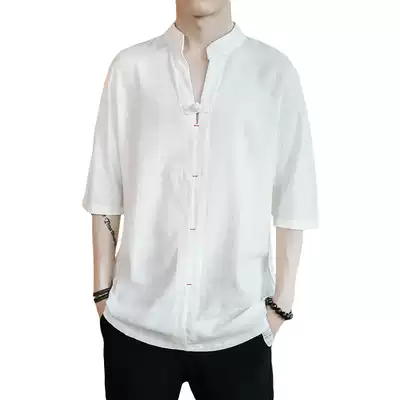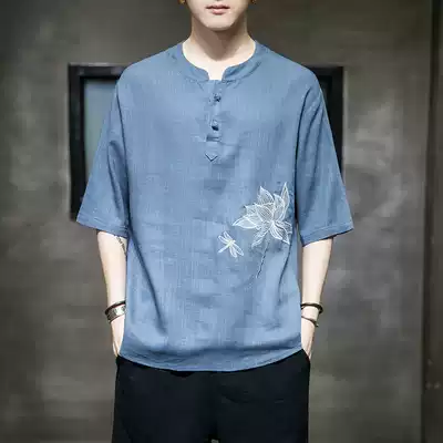 Summer Chinese style men's linen short-sleeved Tang suit Loose large size middle sleeve three-quarter sleeve T-shirt Cotton linen jacket half-sleeved top