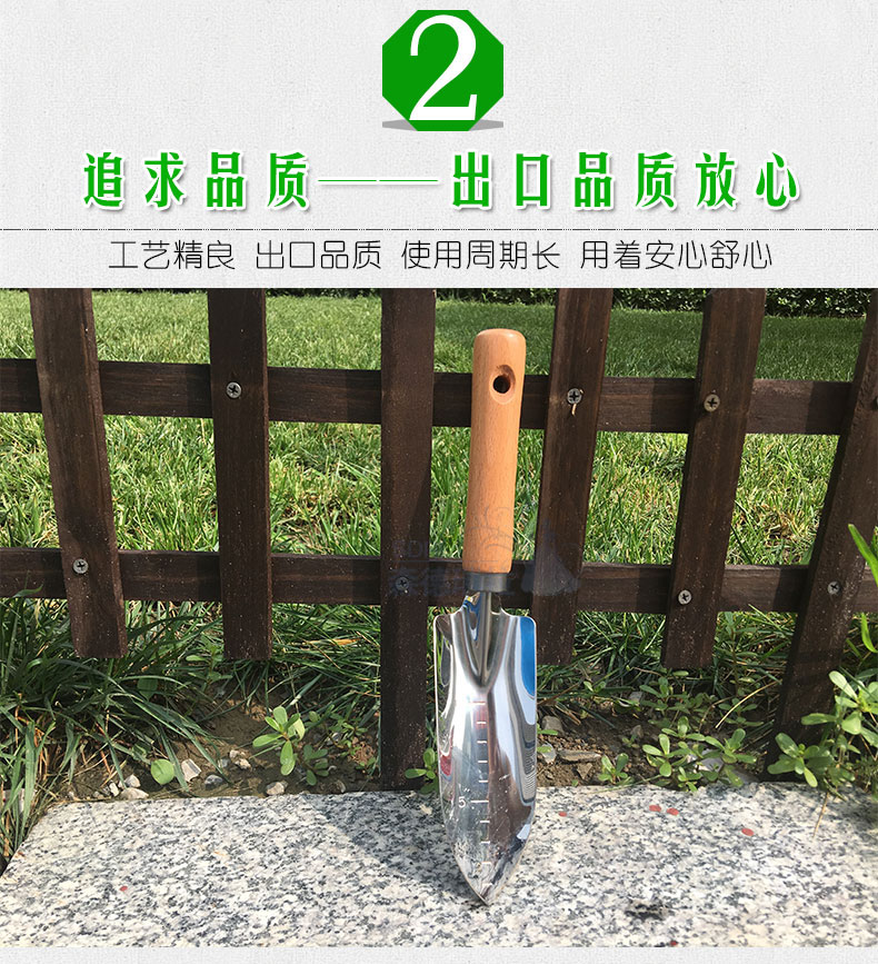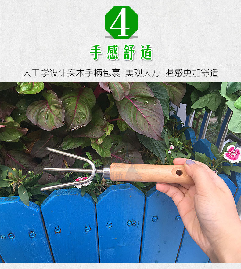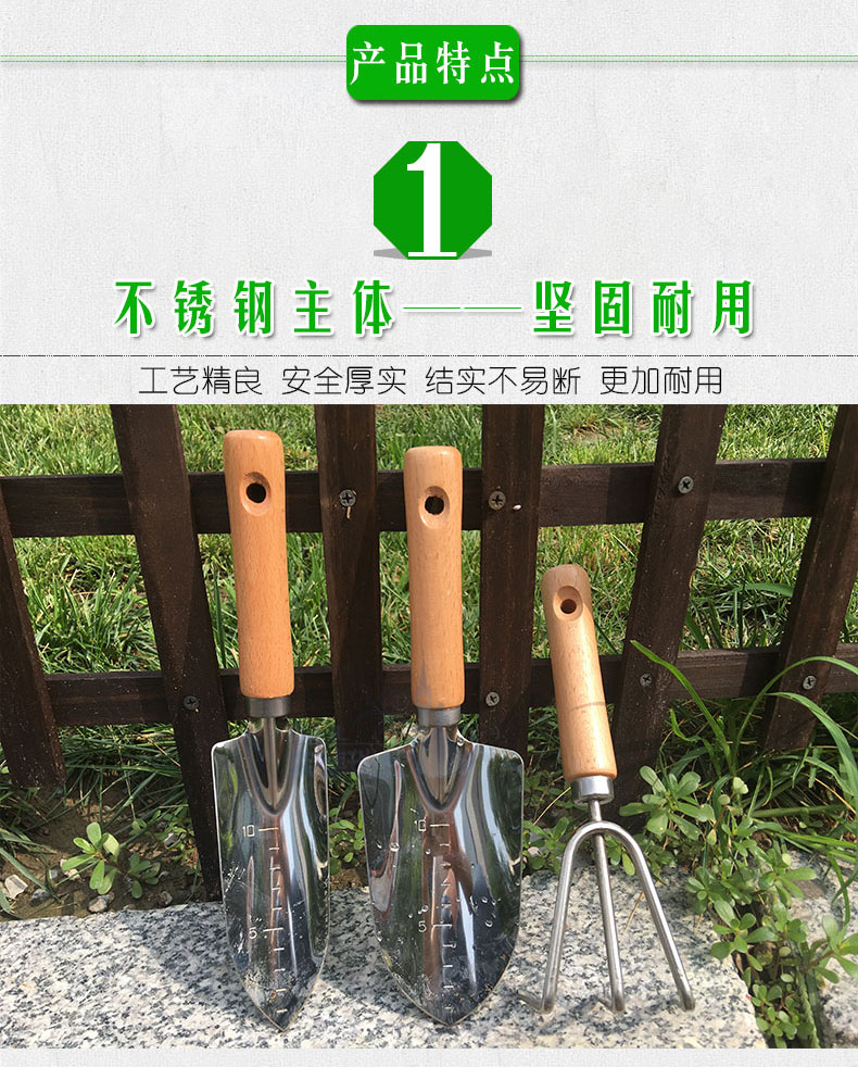 Wooden handle stainless steel three-piece set of loose soil small shovel wide shovel rake small three-claw set flower transplanting pot transfer tool