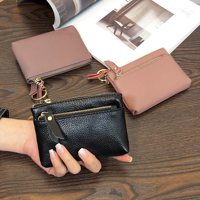 2021 European and American big cards genuine leather short wallet woman Jane about double pull chain Bull Leather Zero Wallet small frescoed coin bag