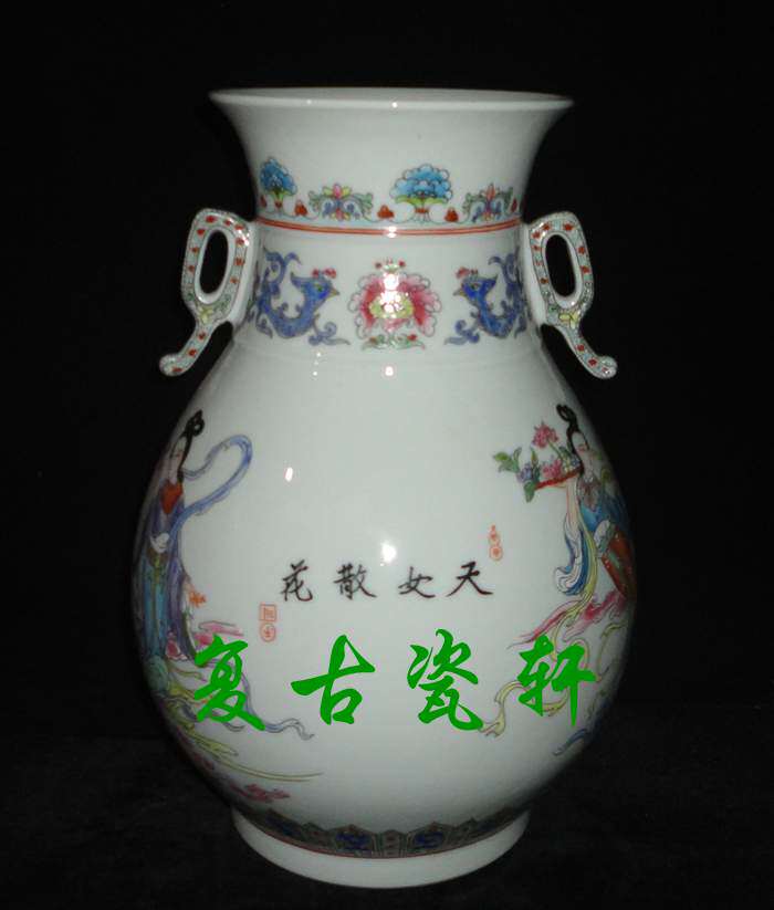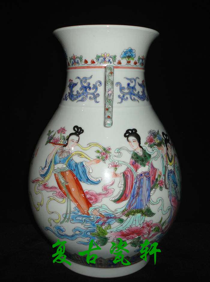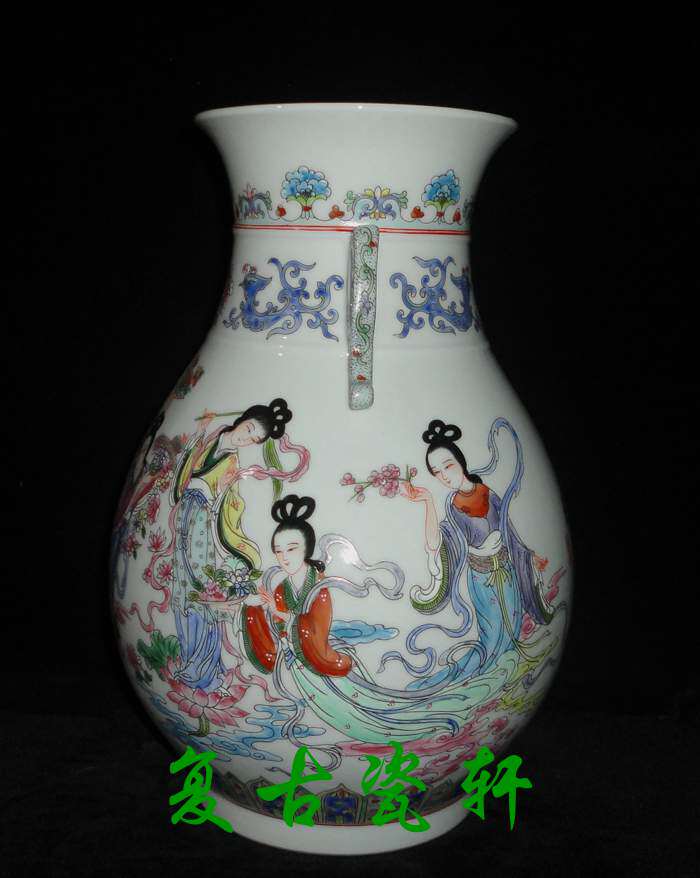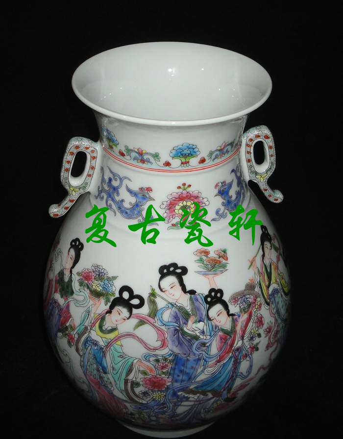 Jingdezhen factory goods porcelain art porcelain art porcelain factory fine powder color hand-painted figure sky female prose double ear futher barrel vase