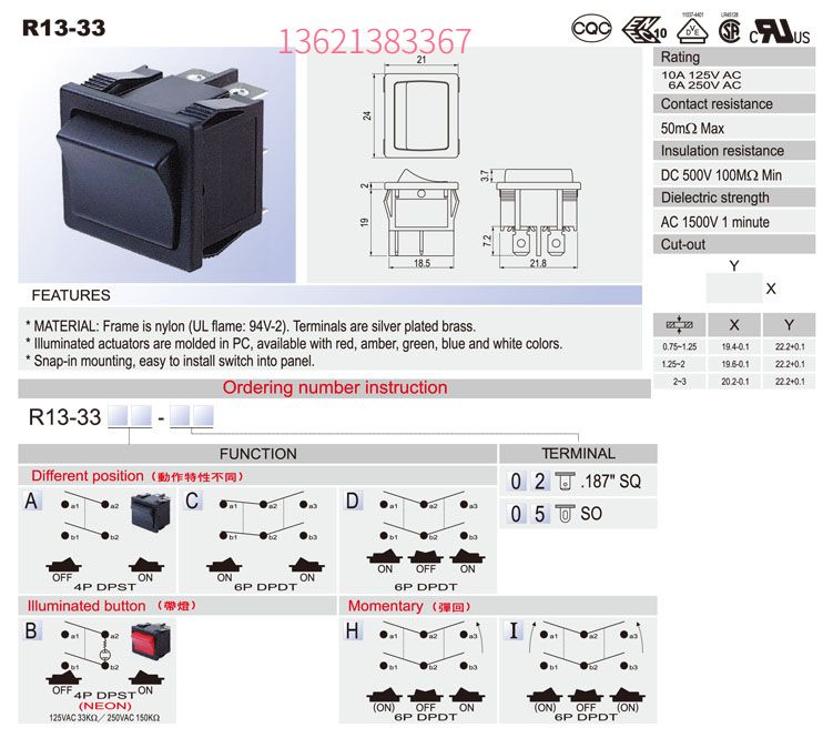 R13-33A square rocker switch four-pin two-way black with light red and green two-gear rocker Taiwan new SCI