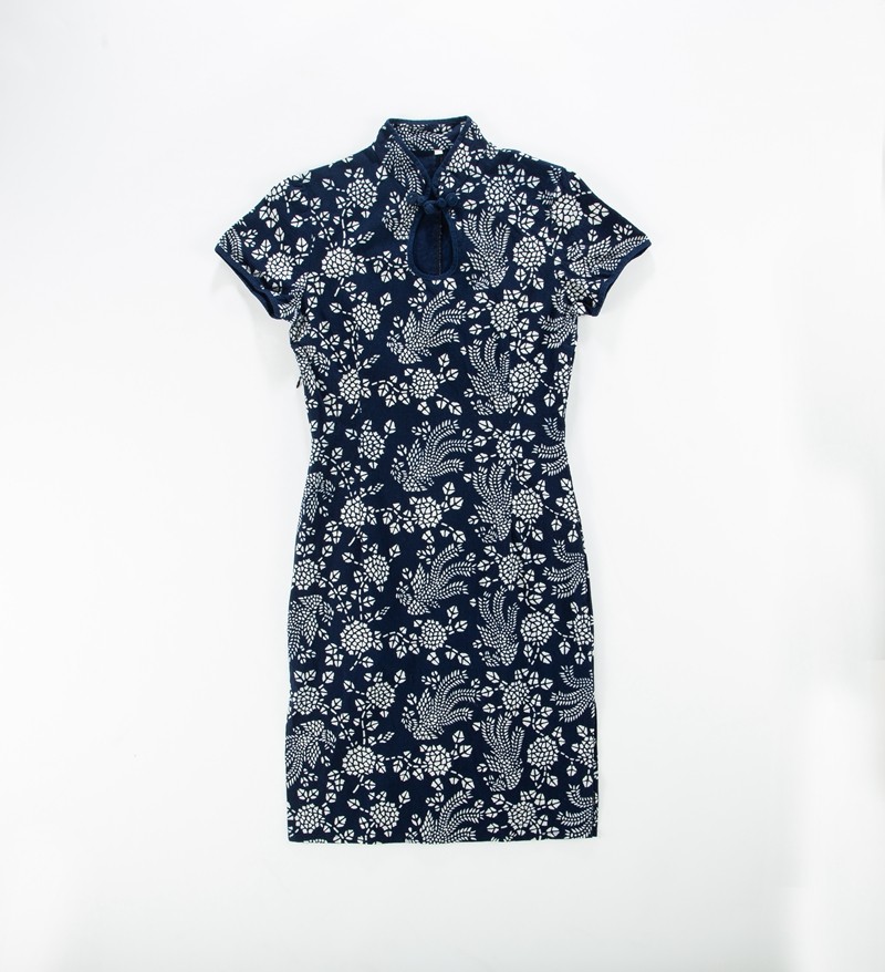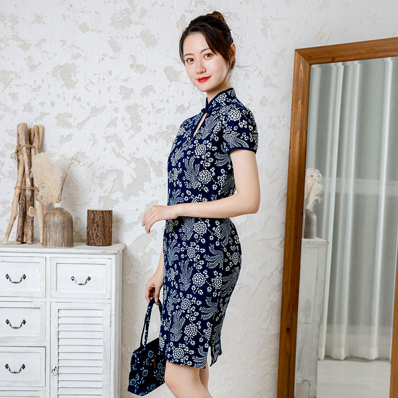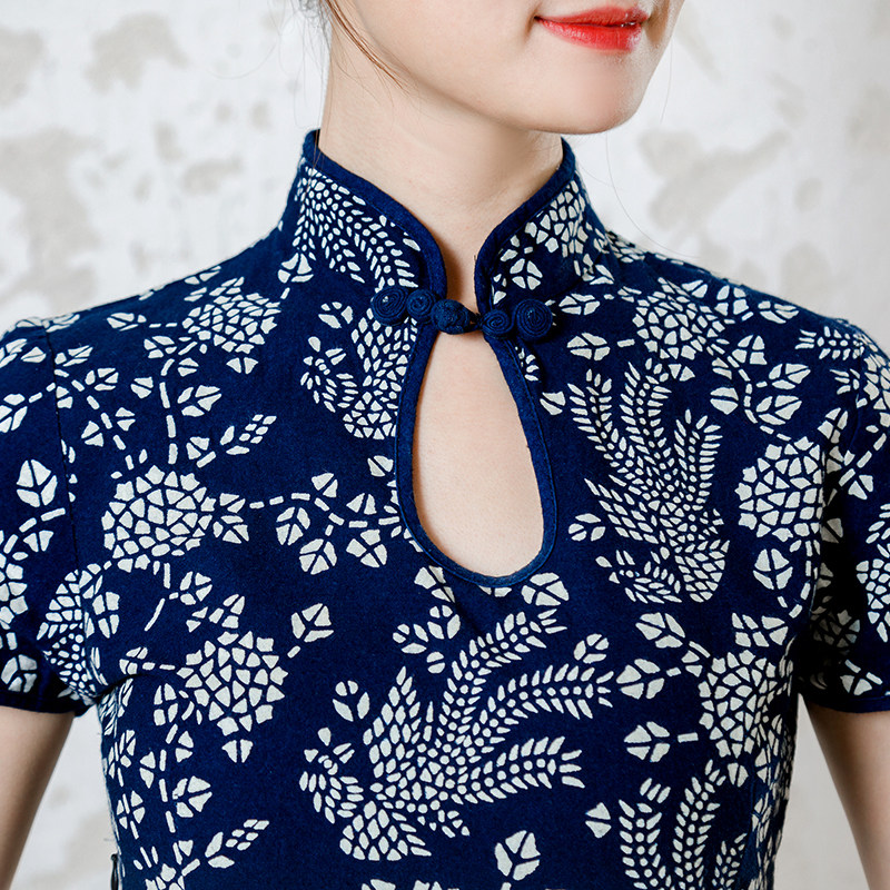 Uzhen Featured Authentic Handmade Blue Printed Cloth Short Sleeve Qipao National Wind Retro Drop Vertical Collar Pure Cotton Foreign Dress