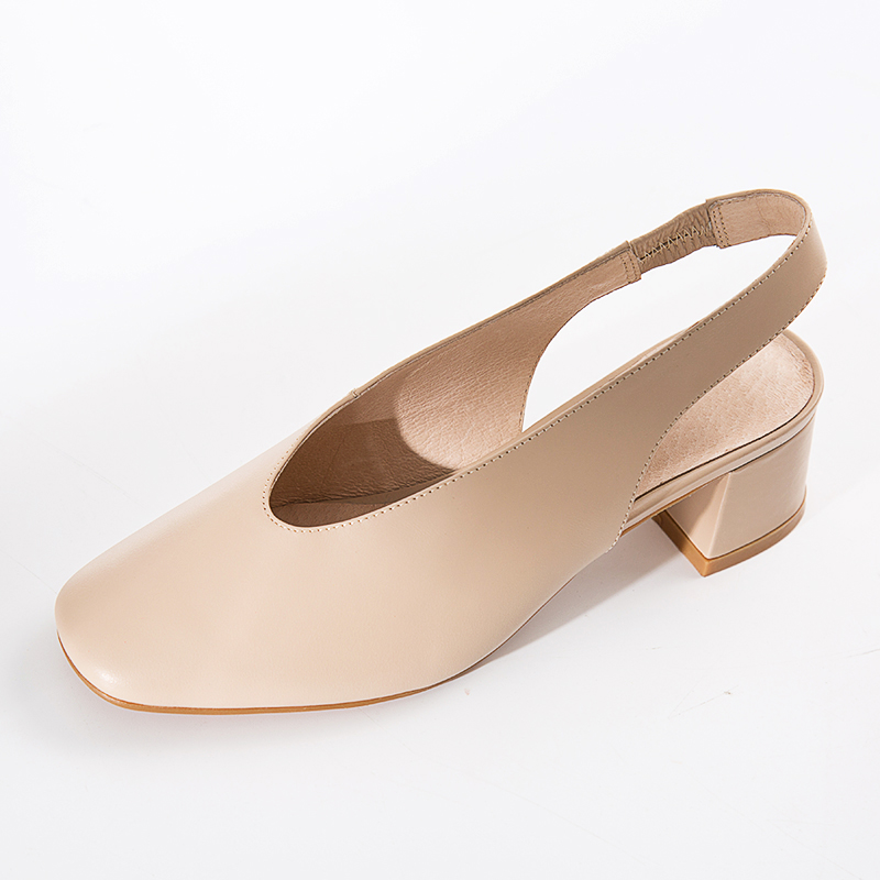 Summer Korean version thick heel back empty sandals big size genuine leather grandma shoes V shallow mouth square toe medium heel single shoes witch shoes