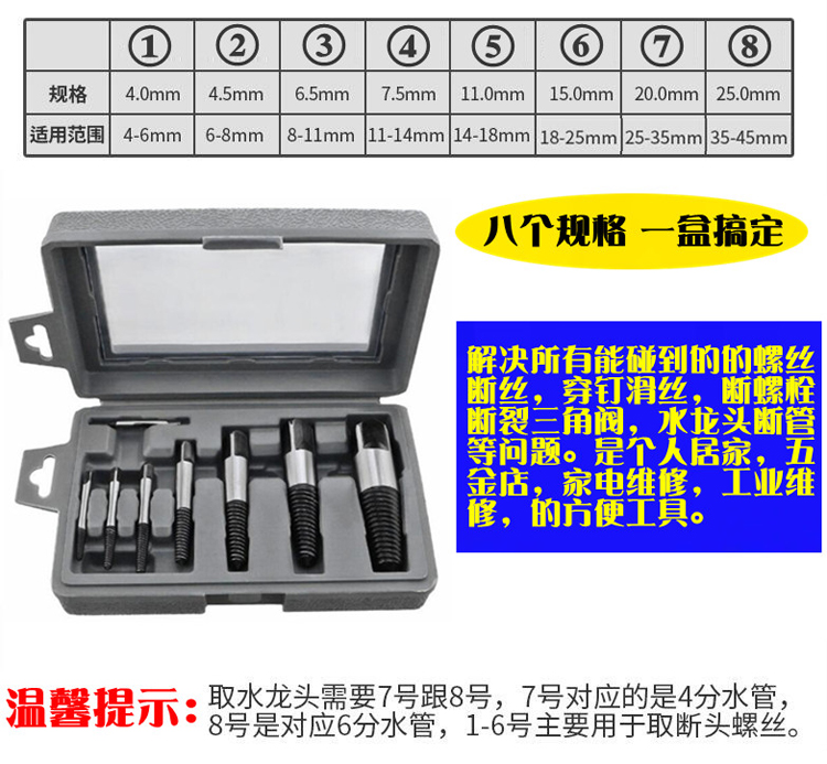 8 Pieces Multifunction Wrench 4 Sub-screw tapping (repair No. 7 water pipe) 6 Sub-screw tapping (repair No. 8 water pipe) No. 7 extractor (taking 4 water pipes) 8 Number of extractor (taking 6 sub-pipes) 5 pieces