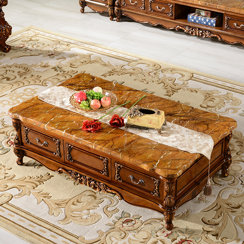 Warm tree furniture European style solid wood long coffee table marble surface with drawer storage coffee table living room matching sofa coffee table