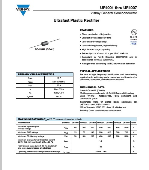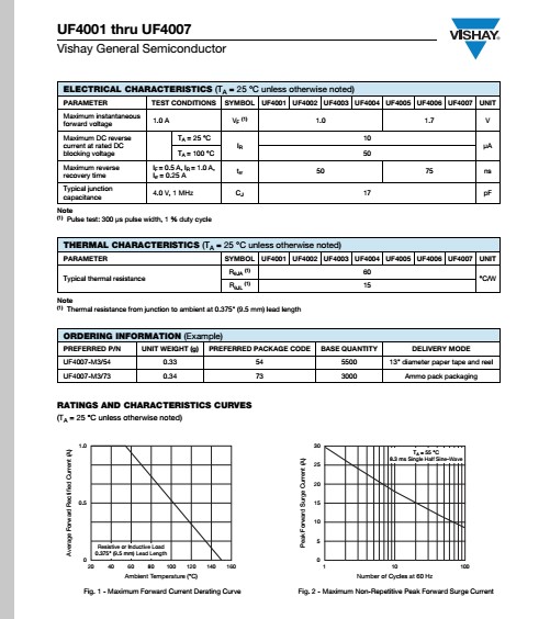 (50) UF4005 UF4005-E3 73 package DO-41 1A 600V fast recovery diode