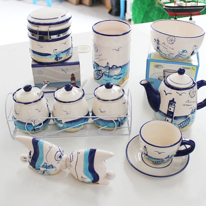 Blue ceramic bowl, blue ceramic set, two fish seasoning jars, blue ceramic airtight jar, blue ceramic cup, dish clearance, single ceramic small jar (with lid), clearance ceramic jar, single ceramic coffee cup, single blue pottery