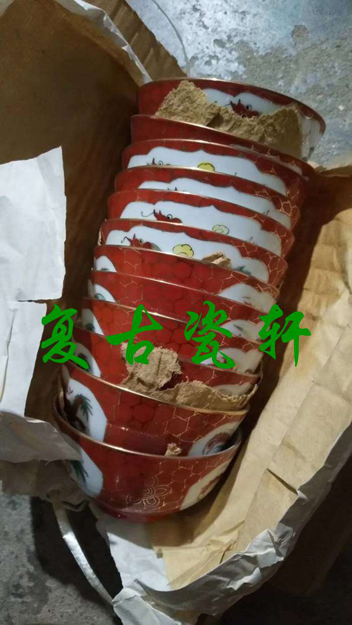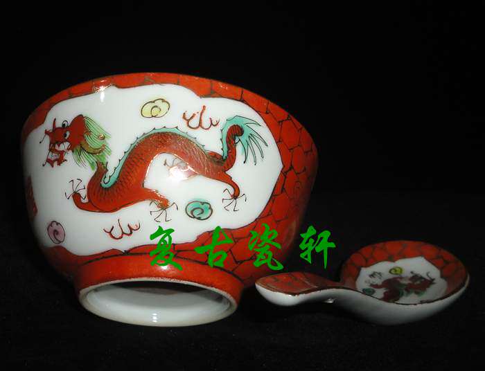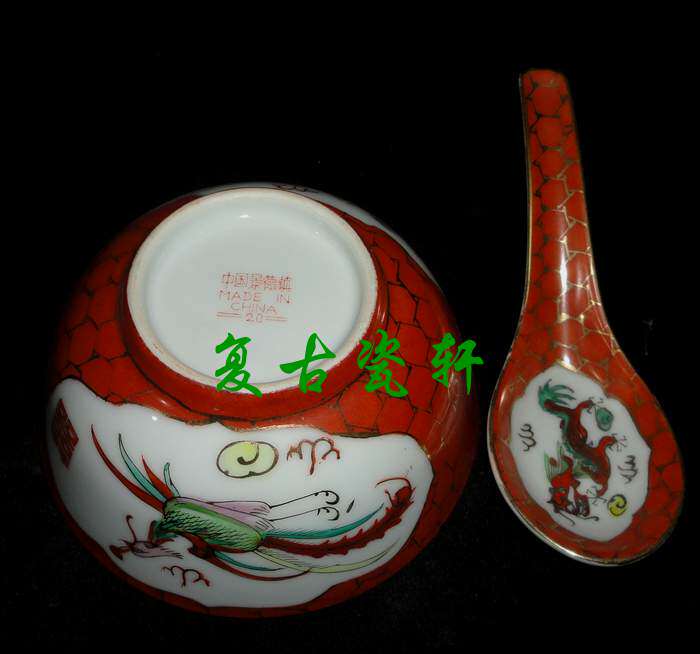Jingdezhen Cultural Revolution factory porcelain pastel hand-painted coral red gold dragon and phoenix two heads of rice, a bowl and a spoonful