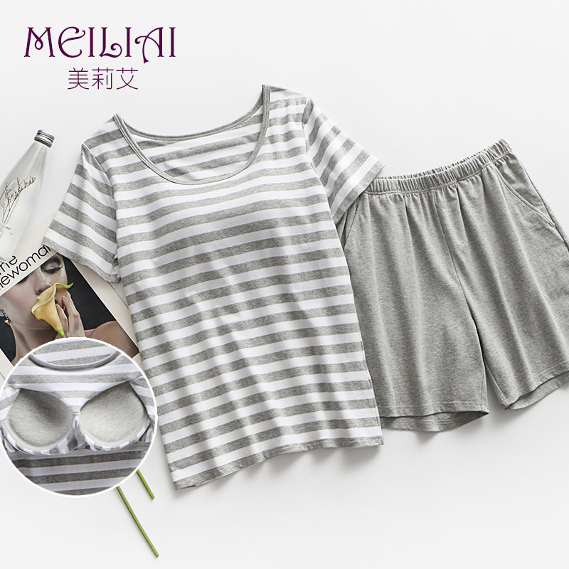 Strip Japanese Pajamas Short Two-piece Set with Breath Mat Short Sleeve Household Lady Spring and Summer Thin