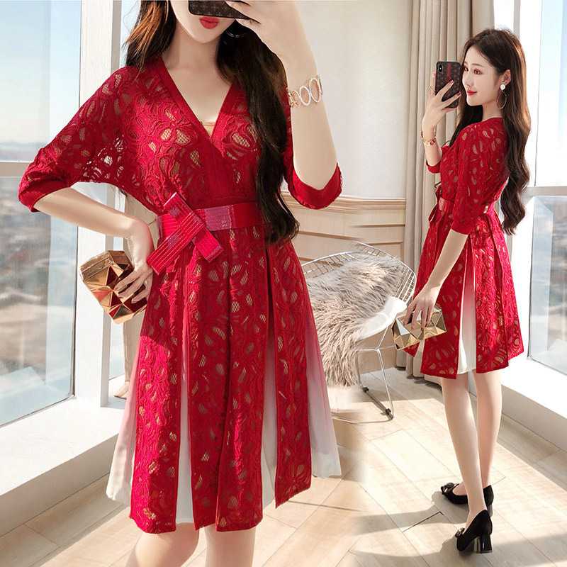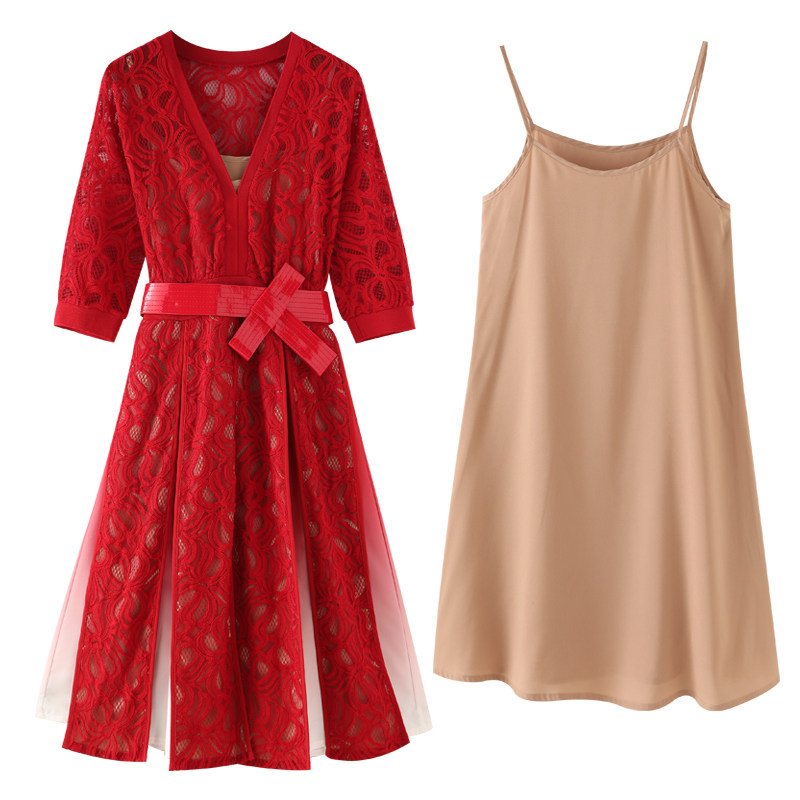 Dress suit skirt two-piece autumn dress 2022 new sexy gradient lace early autumn gentle red dress