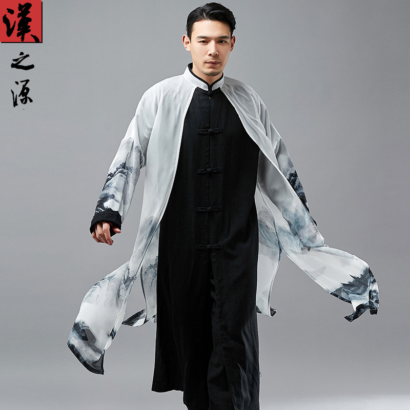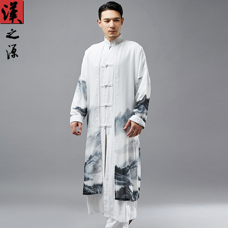 Fake two cotton linen blouse blouses Gongfeng men's clothes standings Chinese style Tang style performance Long gown Chinese mantra mansuit-Taobao
