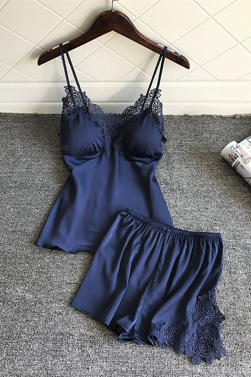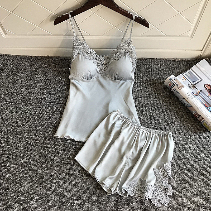 Japanese shorts suit female summer sexy silk thin ice ribbon chest pad adjustable strap pajamas two-piece set