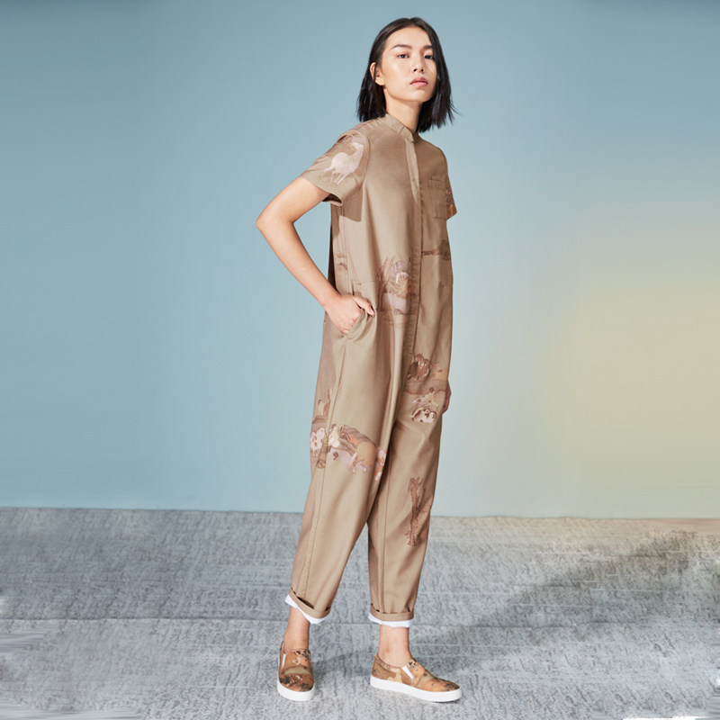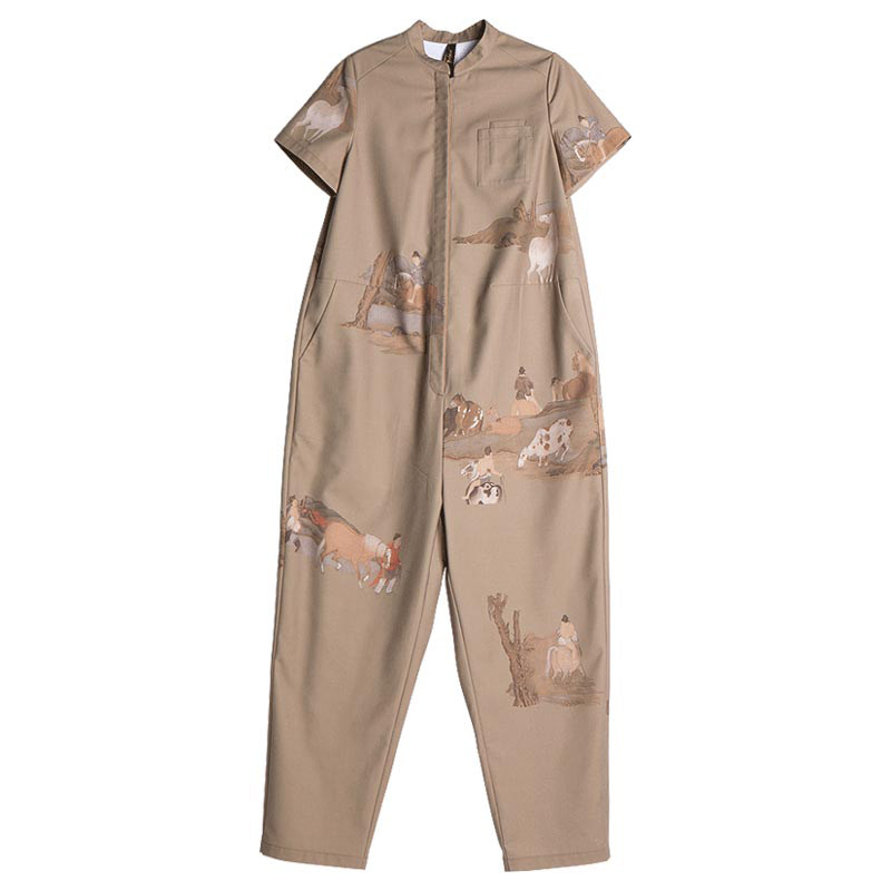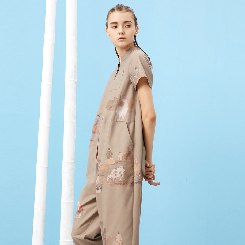 (Mustard original)Longju Chinese style Chinese stand-up collar Jumpsuit Half-sleeved printed design profile jumpsuit