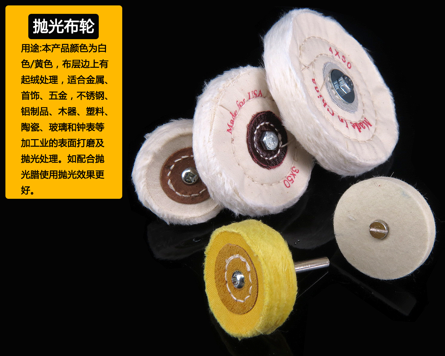 2 inch with handle white cloth wheel (3 0mm handle) 2 inch with handle yellow cloth wheel (6mm handle) 2 inch with handle white cloth wheel (6mm handle) 3 inch 1 floor with handle white cloth wheel (6mm handle) 3 inch 2 layers