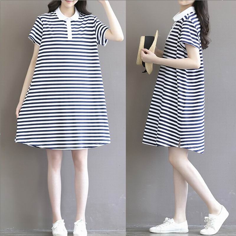 Loose large size 200 jin pregnant women summer dress Korean version fashion striped T-shirt skirt cotton short-sleeved A-line skirt tide