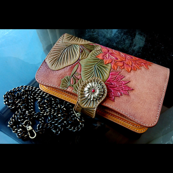 Handmade Cow Leather Men's Bags Women's Bags Tailor-made Bull Leather Sculptures Flower Leather Sculptures Painted Water Floating Lotus Women's Hand Grip Bag Satchel