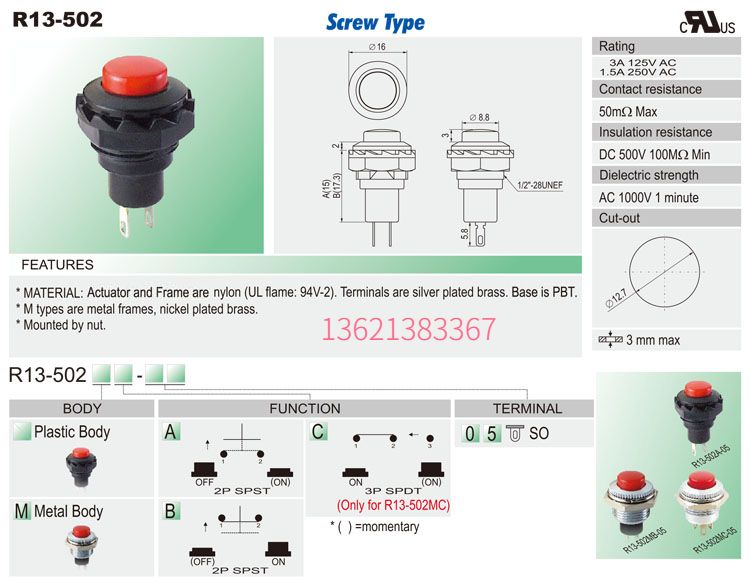 Black R13-502A normally open normally closed button switch single-way lock-free press-on press-off reset Taiwan's new SC