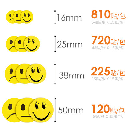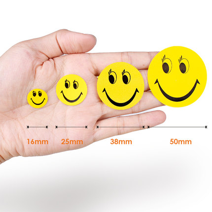 Smiley face 16mm 810 sticker pack Smiley face 25mm 720 sticker pack Smiley face 38mm 225 sticker pack Smiley face 50mm 120 sticker pack