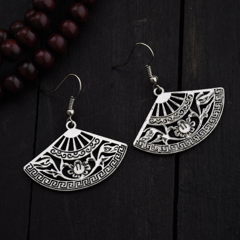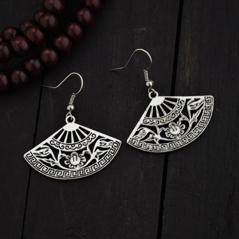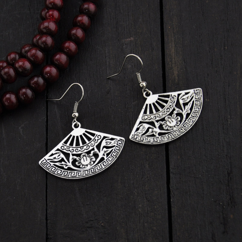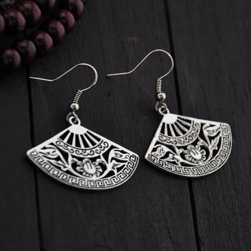 Retro earrings National wind Miao silver hollow fan classical pattern earrings female Thai Silver original jewelry temperament