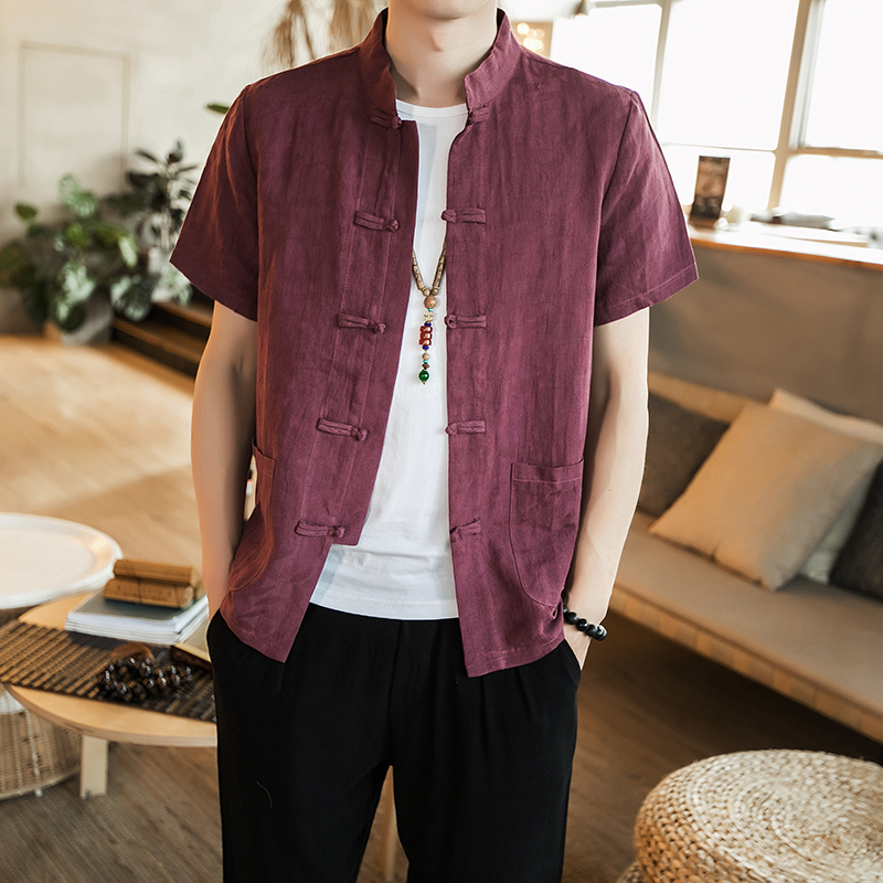 Chinese style Tang suit Chinese wind men's clothing disc button linen short sleeve shirt men's young men's cotton linen blouses national costumes