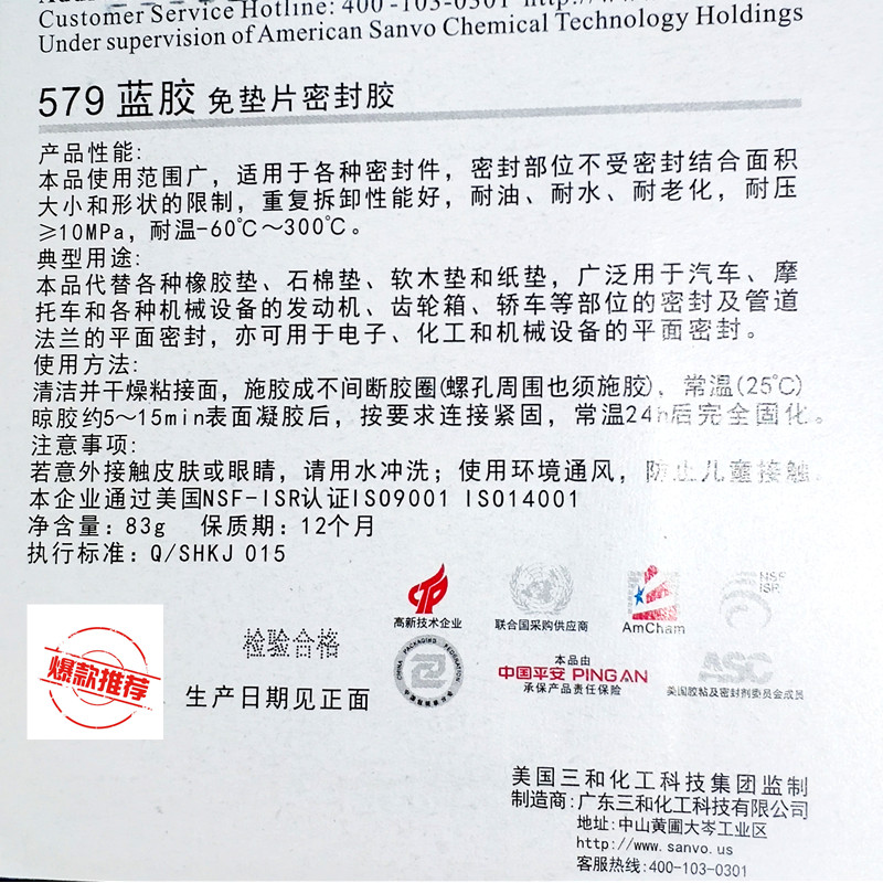 Sanhe 579 blue mechanical sealant gasket-free oil-resistant aging-resistant high temperature automotive sealant 83g