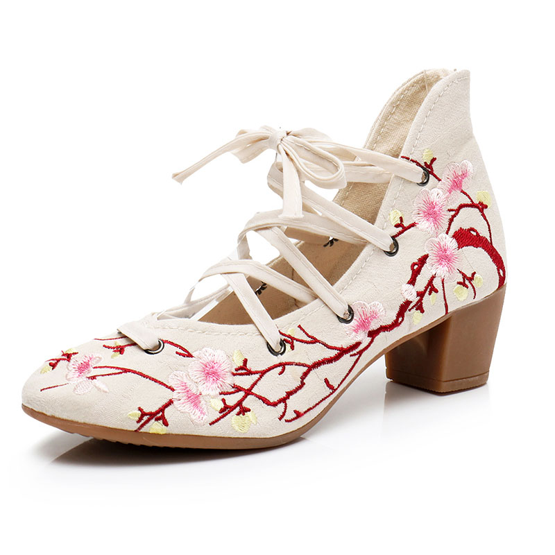 Spring and Autumn Cheongsam Shoes Old Beijing Cloth Shoes Women's Fashion Middle High Heel Hanfu Shoes Chinese National Ancient Style Tea Clothes Embroidered Shoes